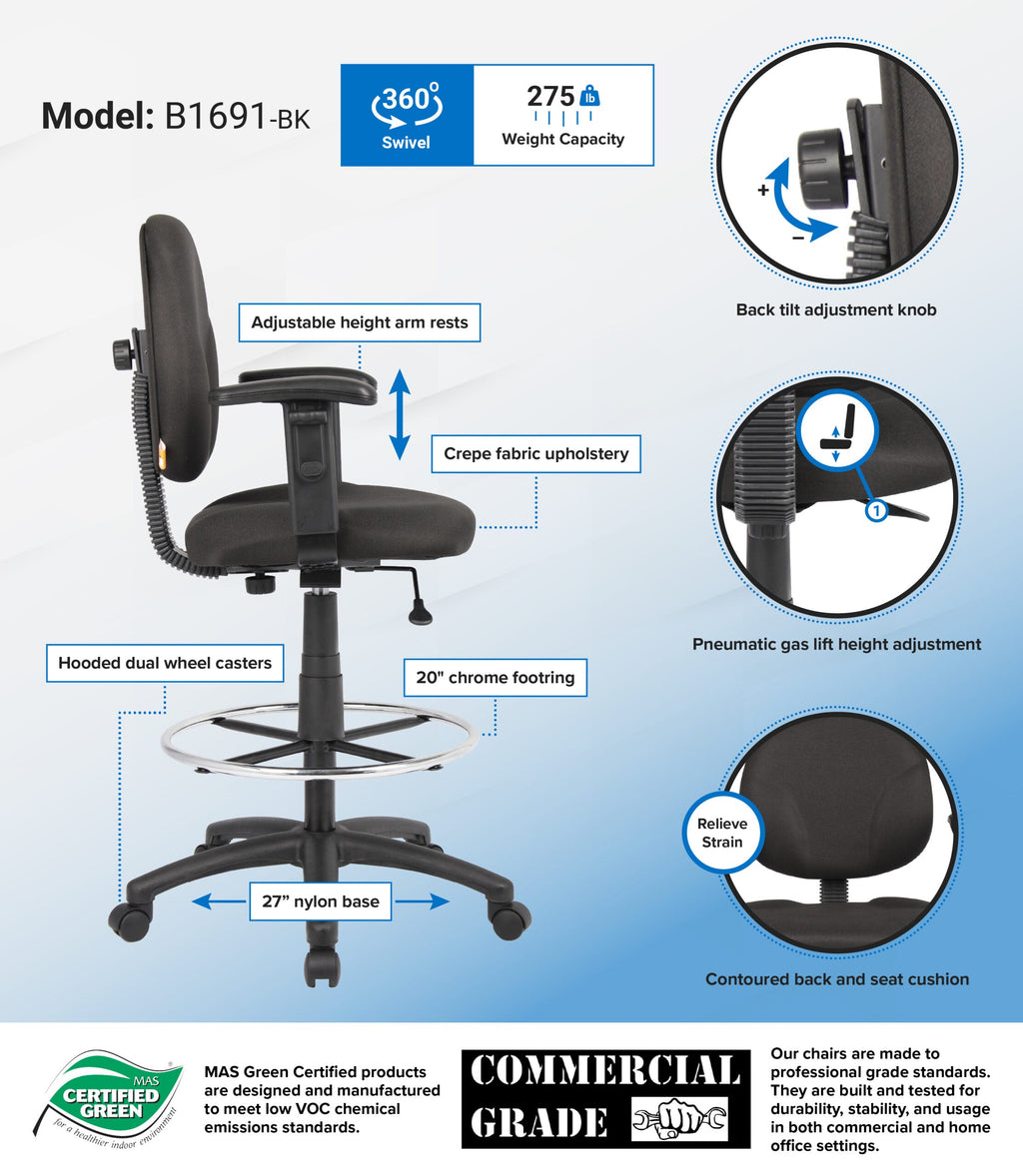 Say goodbye to back pain with this innovative Task chair by Boss. This chair offers a contoured back and seat that provides support and helps relieve back strain. It has thickly padded cushions for additional seating comfort, while it's foot ring ensures your feet gets a rest too.