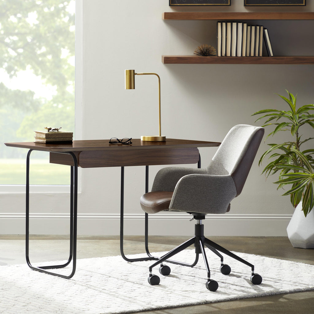 The Desi Collection rolls in with a vintage distressed soft leatherette seat paired with durable fabric back and armrests. Matte black powder-coated steel base glides on large 60 mm casters. Height adjustable.