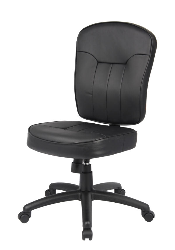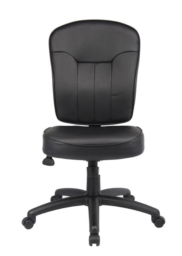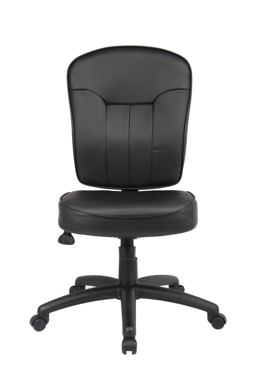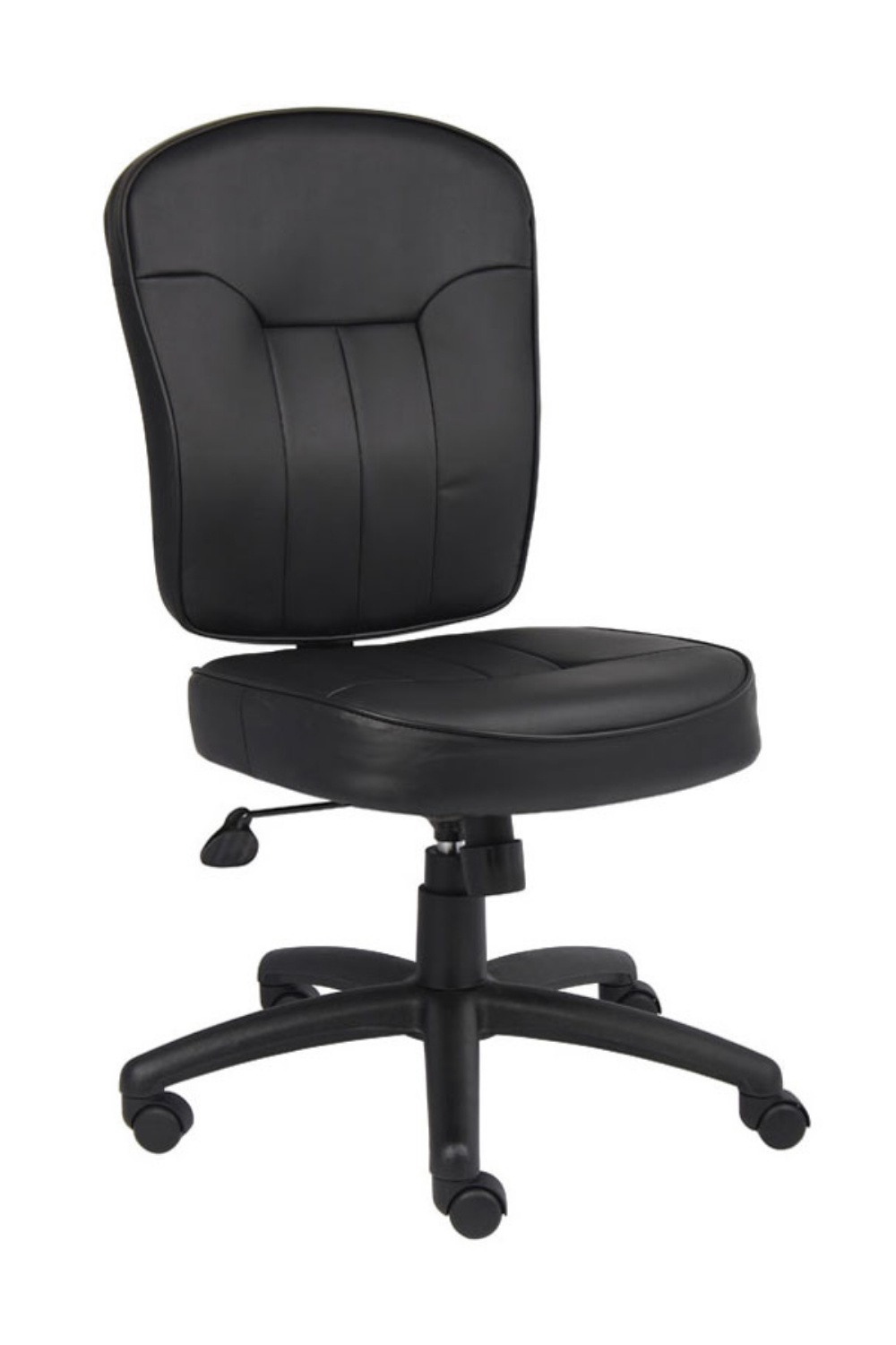 Boss Task Mid Back No Arms Chair B1560 This executive/ managerial task office chair by Boss has an extra large seat and back cushions for added comfort. The upholstery is a polyurethane infused leather that has been added for additional softness and durability. Simple mechanism on the right-hand side provides a pneumatic gas lift seat height adjustment and back lock.