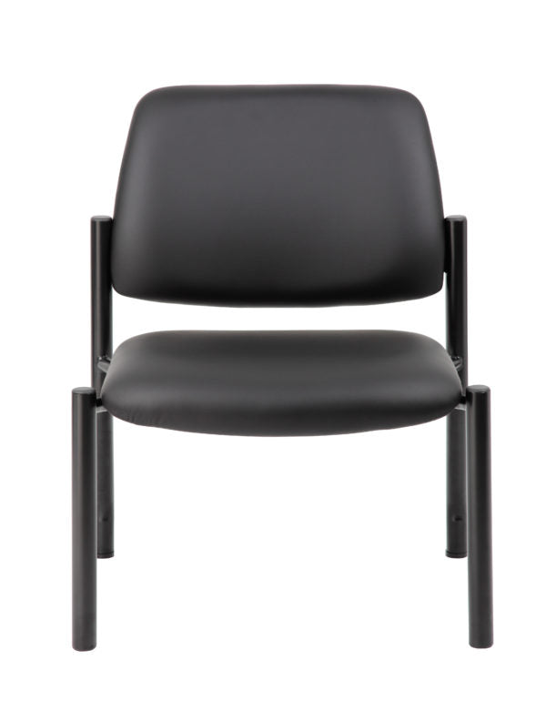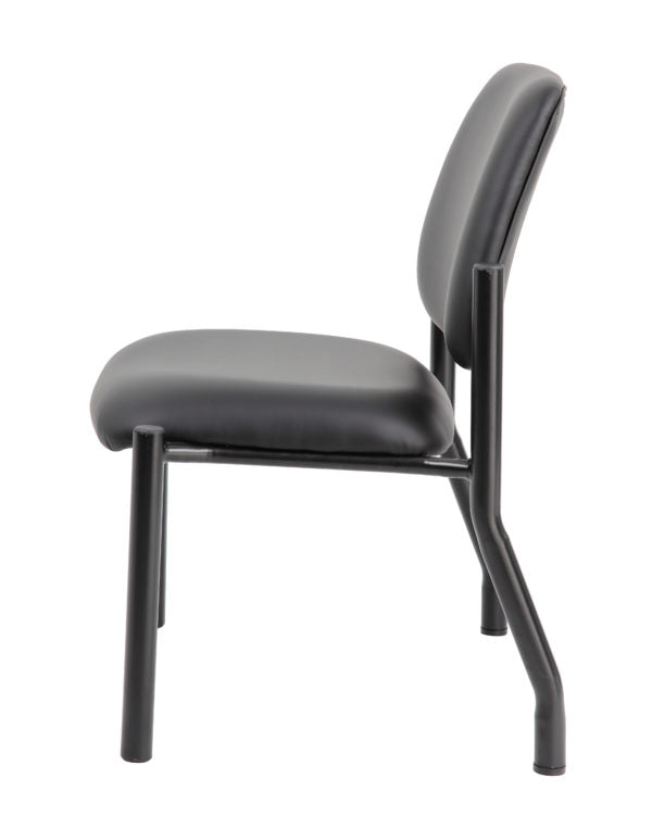 This heavy duty and comfortable mid back guest chair is perfect for anyone seeking additional seating in any room or office. The guest chair is designed with a strong and easy to clean antimicrobial black vinyl material that lends a professional appearance along with a sturdy four leg tubular black steel base that offers coziness and strength. The chair stands at a fixed height with an streamlined armless design and boast a weight capacity of 400 lbs.