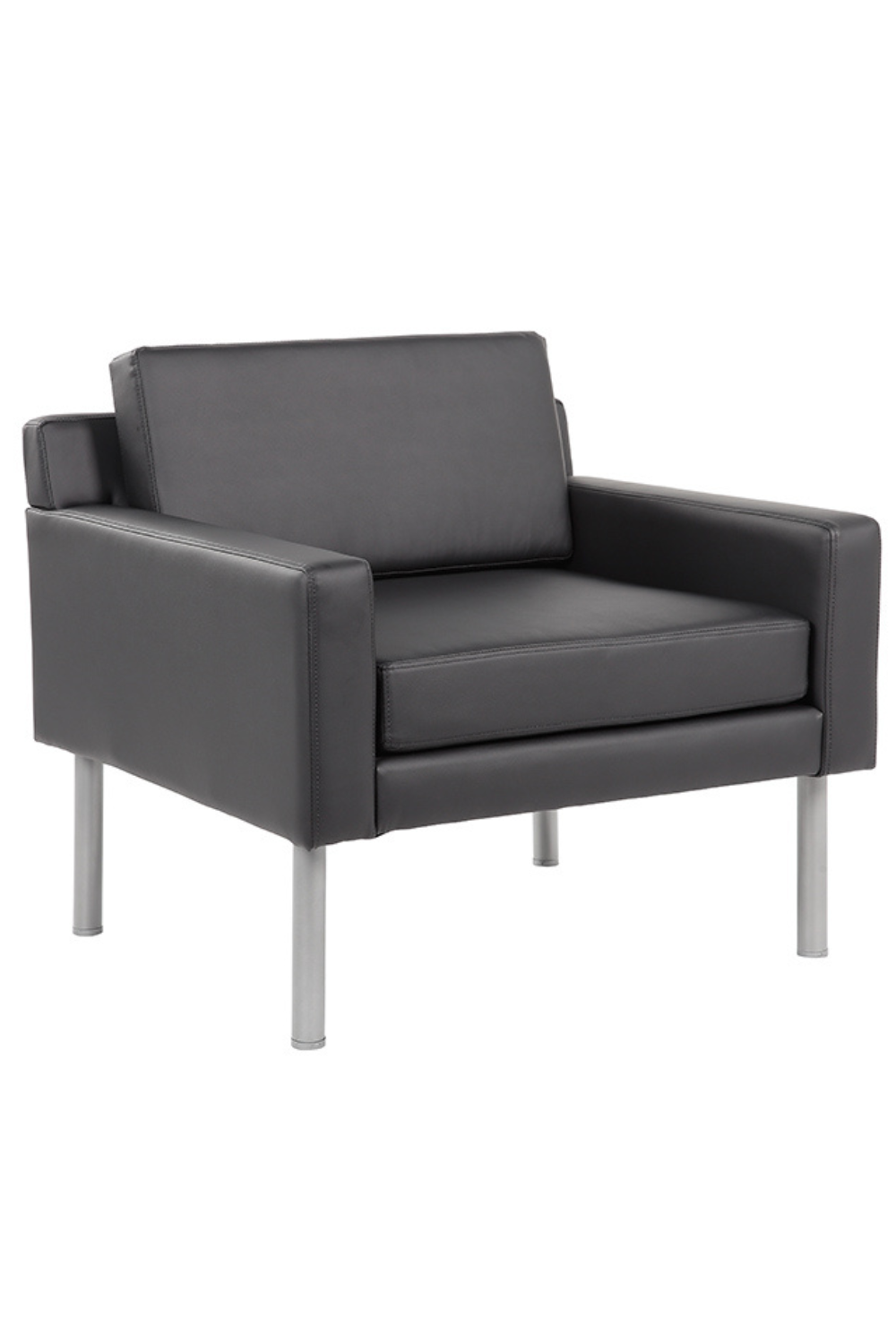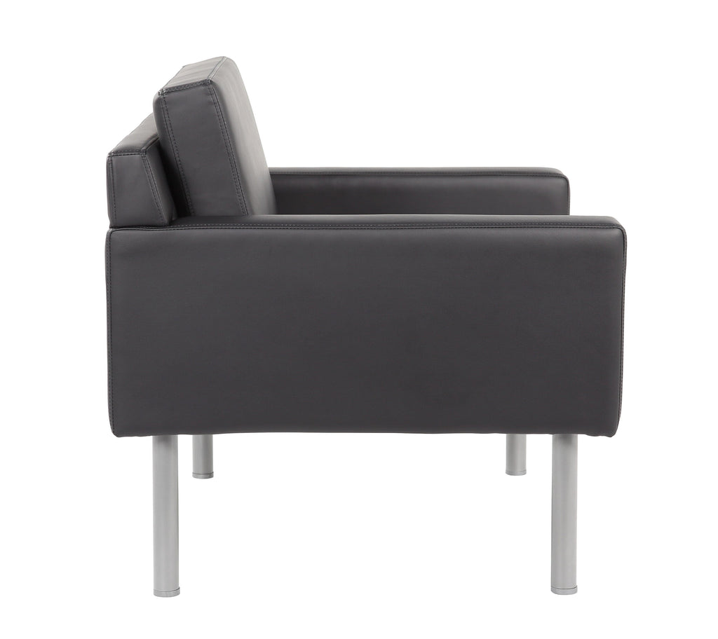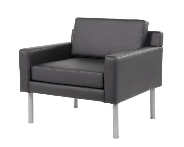 This upholstered lounge chair will look great in any room. It is upholstered in a soft touch of antimicrobial vinyl. Designed with clean lines and fixed box arms. It has a deep, thick cushion that allows you to sink in and relax and it has sleek black steel legs with plastic levelers at the bottom for stability.
