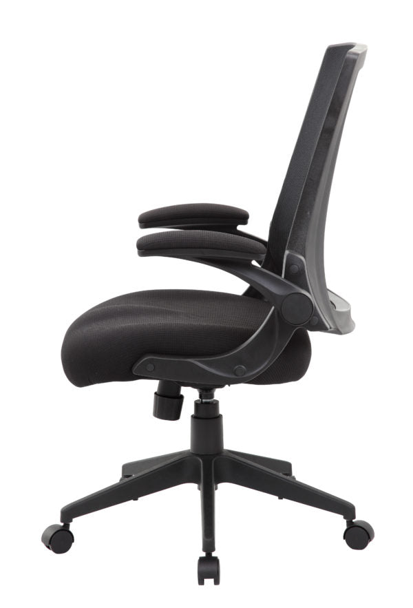 This task chair is a step ahead of the rest with the adjustable, flip arm design and the pneumatic gas lift that allows for easy height adjustments. Comfort and customization are top priorities with the breathable mesh back design and with features such as a spring tilt mechanism, tilt tension, and the upright lock. It also features a 25-inch nylon base with 2-inch nylon dual-wheel casters for a smooth roll and a weight limit of 275 lbs.