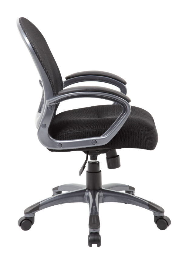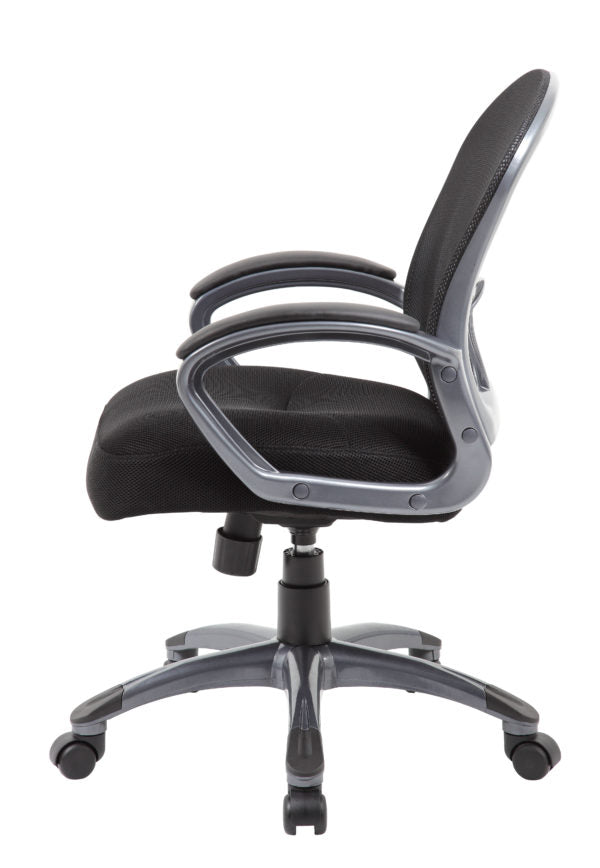 The Ergonomic Mesh Back Task Chair provides ergonomic support and prevents body heat and moisture build-up, keeping you comfortable and cool during extended periods of work. It comes with a 4” padded mesh seat cushion for extra comfort. The padded loop arms are covered with Black Caressoft and make for comfortable and natural arm rests. The adjustable tilt tension control allows you to customize the optimal angle at which you sit. The chair sits on a 25” gun metal finished base with black caps. The hooded double wheel casters make it easy to move and shift directions.