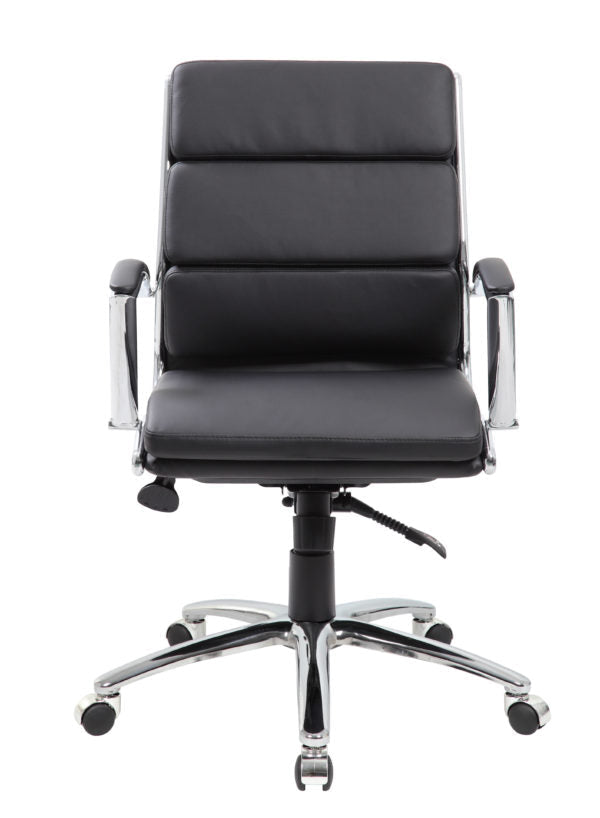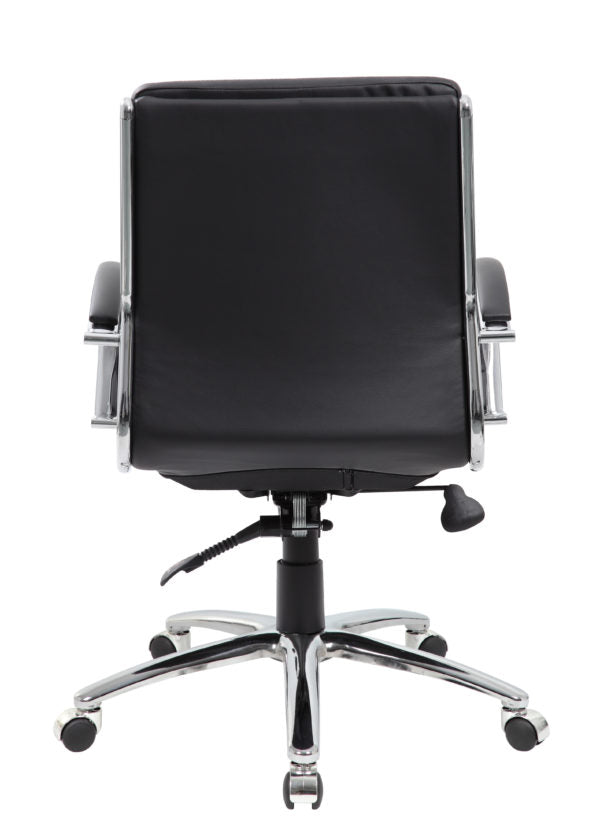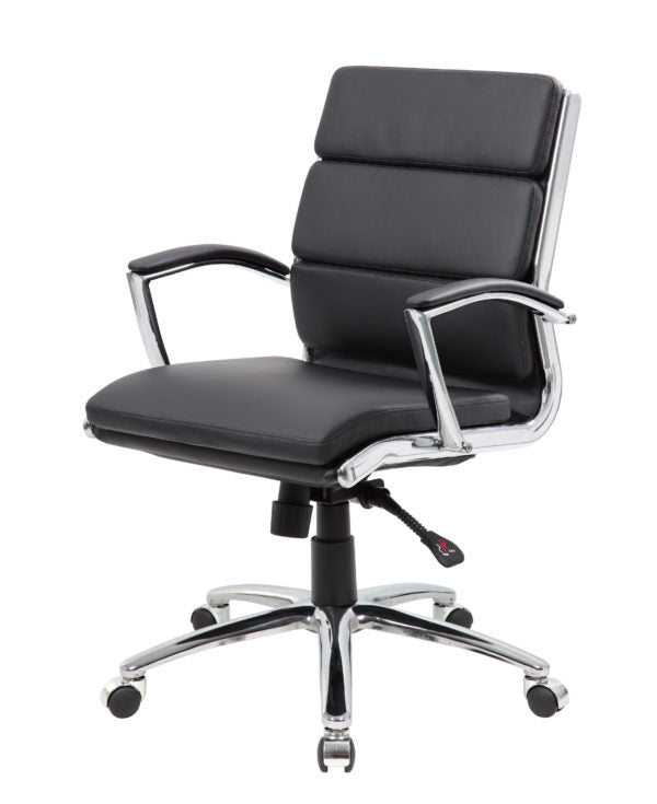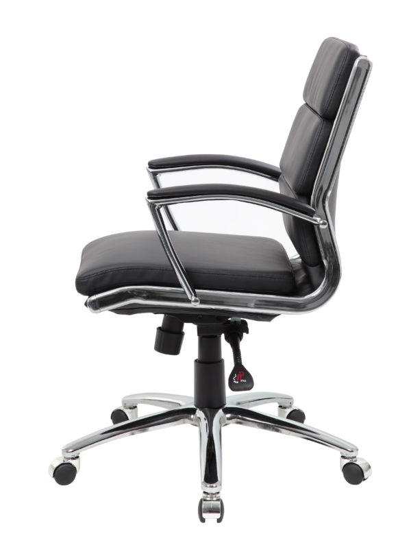 The mid-back executive CaressoftPlus chair in black with the metal chrome finish is as comfortable as it is handsome. The chair utilizes a two paddle mechanism which designates one paddle for lift and one paddle to release spring tilt or lock; it is very heavy duty. The chair is made with a material called CaressoftPlus which is a trademarked vinyl that is an ultra-soft, breathable upholstery that looks & feels like leather, but more durable & easy to clean. The chair also offers tilt tension, a pneumatic gas lift and an upright lock. It has been designed with a sturdy 27 inch chrome base with 2 inch nylon dual castor wheels and has a weight capacity of 275 lbs.