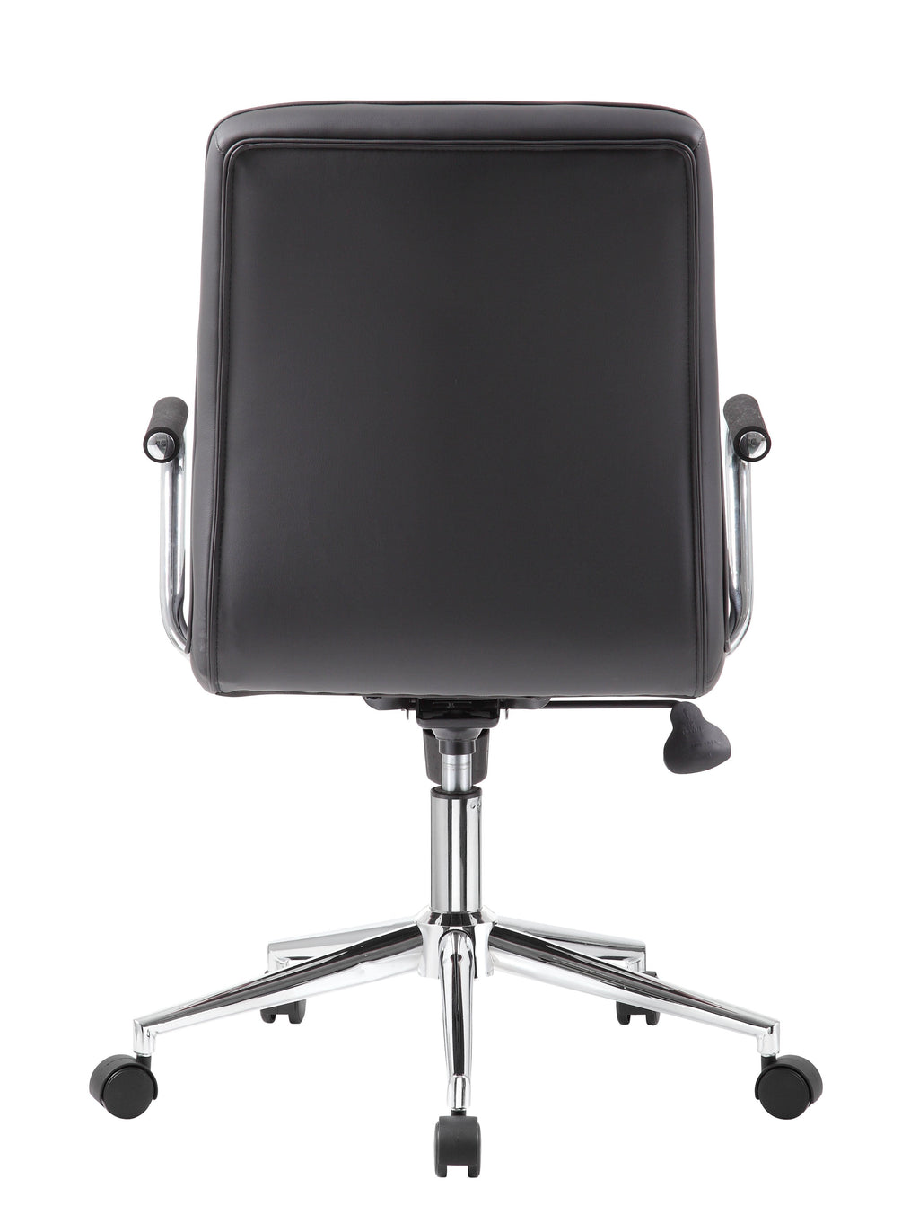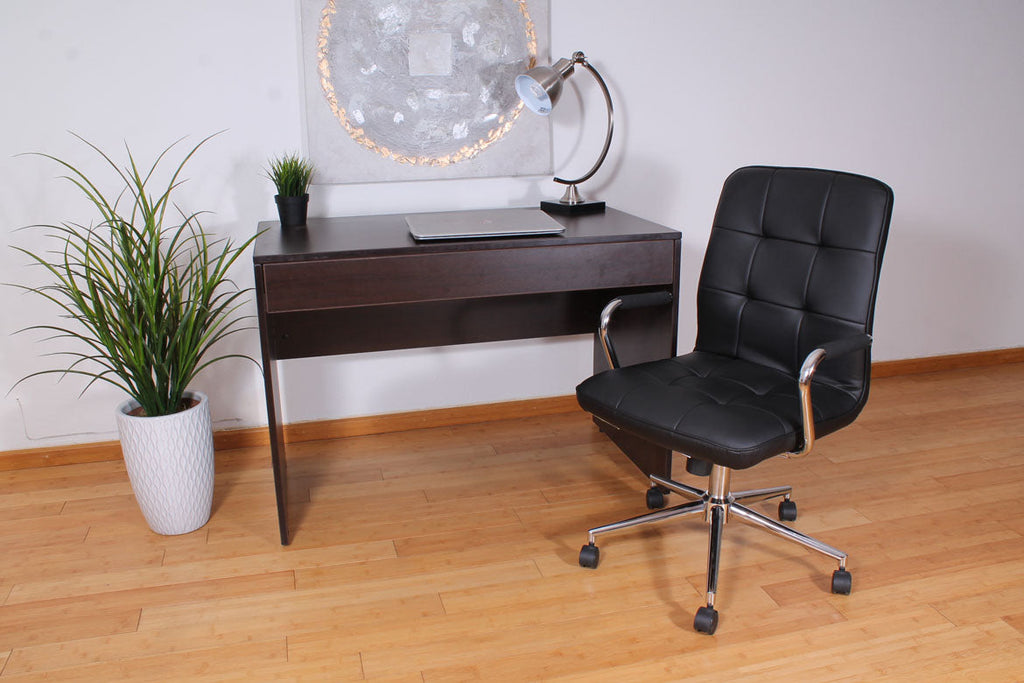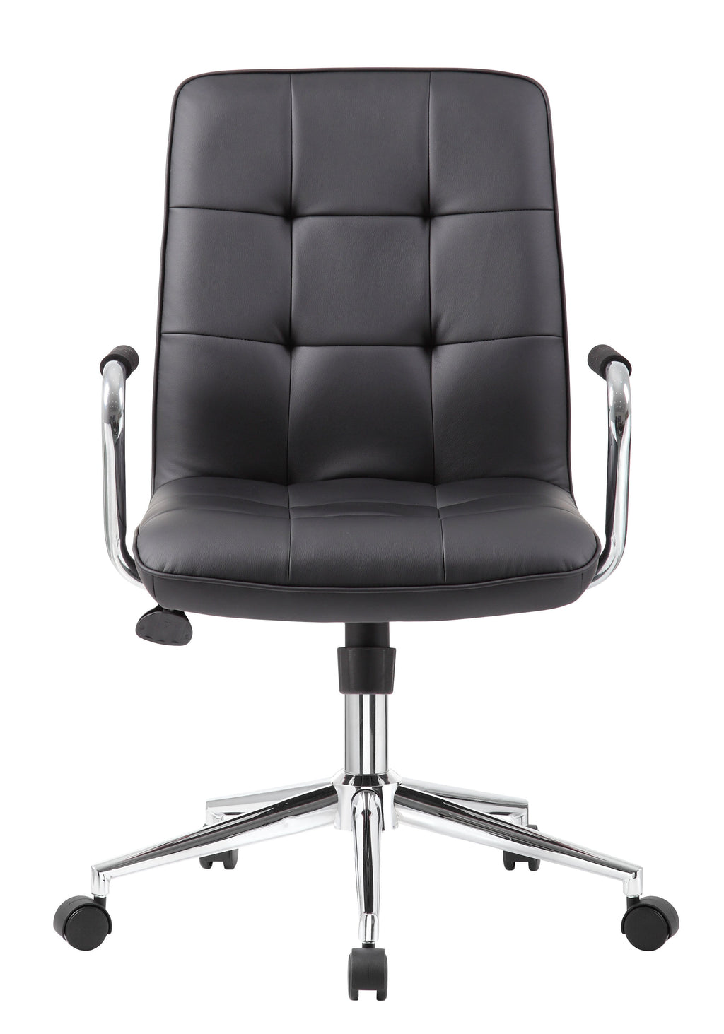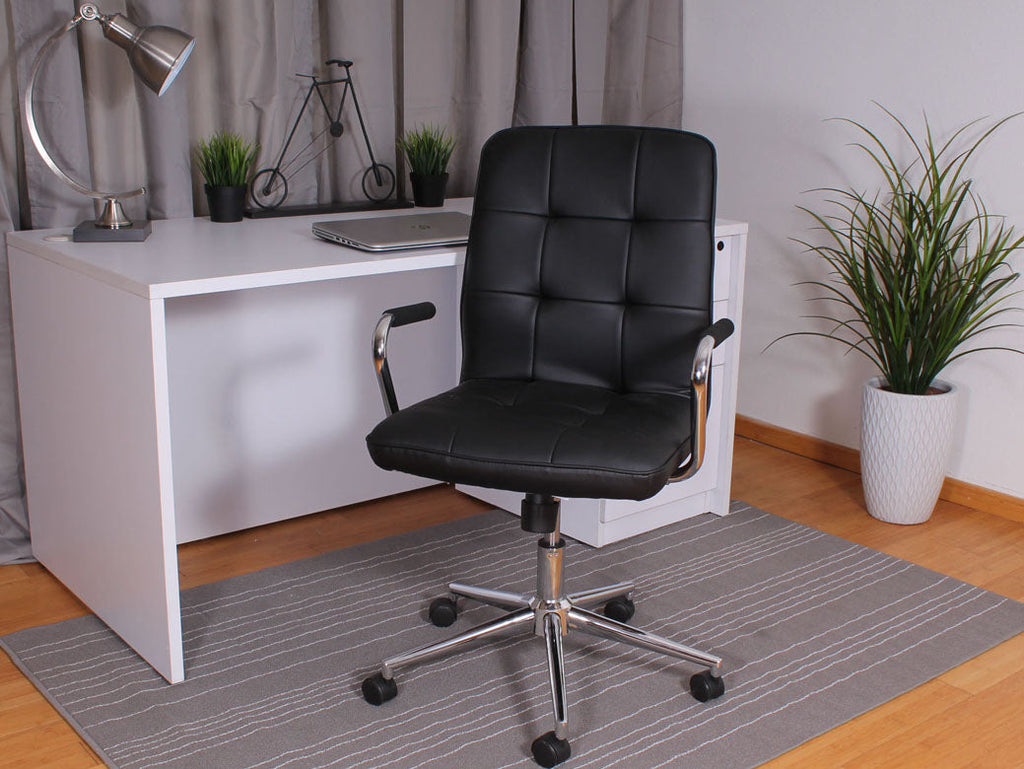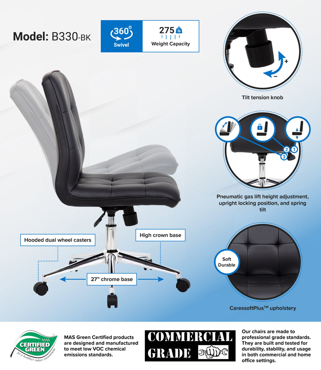 The Millennial Modern Home Office Chair in white is made with CaressoftPlus or Fabric material. CaressoftPlus is a trademarked vinyl that is an ultra-soft, breathable upholstery that looks & feels like leather, but more durable & easy to clean. The 27 inch chair base is designed with fancy high crown chrome and has 2 inch nylon dual wheel castors for smooth rolling. The chair has a 275 lbs. weight limit in addition to offering tilt tension, a pneumatic gas lift and an upright lock.