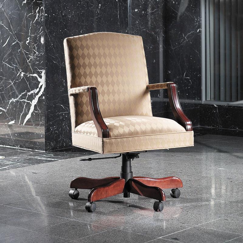 High Point Classic Collection Martha Washington Mid-Back Chair - 3477 Classic Design and Functionality With timeless styles and options, the HPFi Classic Collection is a winner in many oce environments. The HPFi Classic Collection is comprised of several "former" series of seating previously identified as Scoop, Quick Silver and Traditional. Many oer a choice between wood and urethane arms and base. Options on many of these models include knee tilt controls, trim, nail heads, jury bases, glides and a variety of casters for various floor surfaces. Product Details •Thick, padded contour molded foam in seat and back •Five-prong base with dual wheel carpet casters •360° Swivel seat with waterfall front edge •One touch pneumatic seat height adjustment •Standard swivel tilt mechanism •Swivel chairs feature wood cap over steel or nylon reinforced polyurethane bases •Hybrid soy-based, CFC-free foam