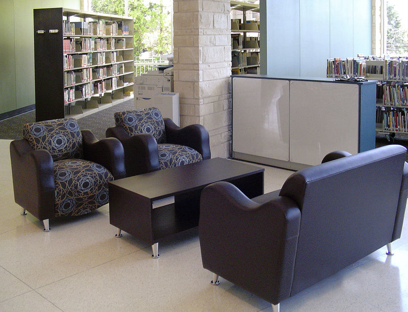 the form. Take a seat and your arms will naturally fall into the gently undulating contour of the fully upholstered arms. Brightly polished aluminum legs add just the right amount of sparkle and visual interest. The cushions are plush and supportive so that waiting goes from a "chore" to a "pleasure." Round and oval table selections make for a complete collection.